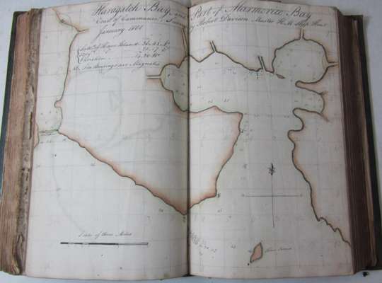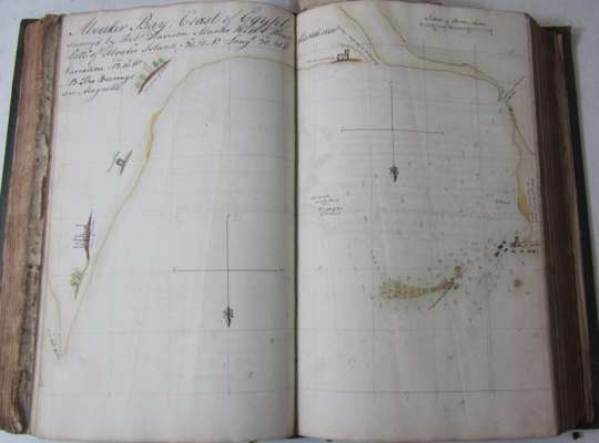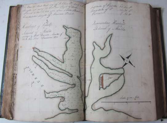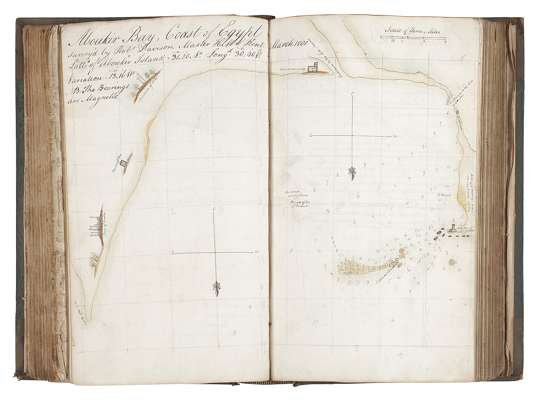 "A journal of the proceedings of His Majesty's Ship Kent commencing the 1st May 1800 and ending the 7th October 1803, kept by John Jordan Arrow, Mid.n; under the command of W. Hope Esq. to the 18th June 1801, then Mr. Mansell Esq. to the 7th Sept. 1801, then Edw. O'Bryan Esq. to the 4th May 1803, & Jno. Stuart Esq. to the date hereof, J.J. A.". Folio, 315 x 190mm., c. 500 pages, with watercolour plans with soundings of Valetta, Quarantine Harbour, Bay of Marsa Sirocco, St. Pauls (Malta), Bay of Mamorice, Messina, Haragatch Bay, Keith's Reef, Aboukir Bay, Oristana Bay (Sardinia), nineteenth century half calf, worn
