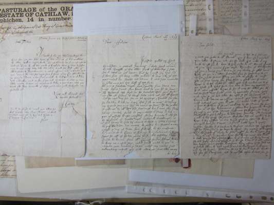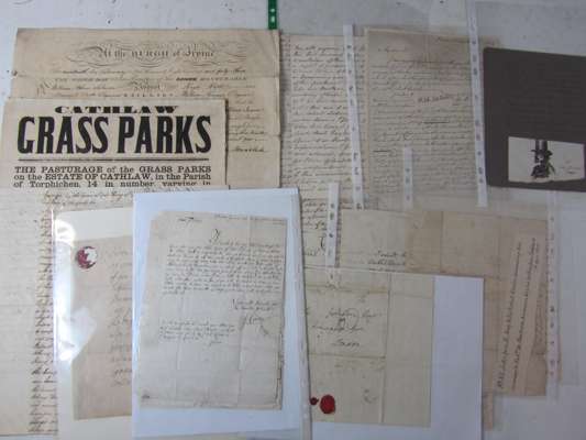 Three letters from Joseph Gordon to his father, Sir Lodovick Gordon of Gordonstoune, at Elgin, 22 Jan.- 25 March 1679, two from Paris, one from London, referring to Duke of York, conflict between Charles I and Parliament, attack on Danby, the Popish plot, & activities of France; Patrick Murray, 5th Lord Elibank (1703-1778) to John Johnstone, son of Sir James Johnstone (1697-1772), about the settling of his father's debts, Edinburgh, ?16 Nov. 1768; Ainslie, Sir Robert A.L.S. to John Anstruther, 31 Dec., 1804; Anstruther, John 2 A.L.S. to Sir Robert Ainslie, Edinburgh, 1802-05; Minto, Lady A.L.S. to Col. Drinkwater, 30 Jan. 1808; Lambert, John, Major-General Order from Parliamentary miltary leader that assessors were not to levy from David Lord Cardros (1627-1671) an undue sum, nor that a garrison be put in his house at Cardros, 28 Dec. 1651; and 5 other Scottish ms. and 2 printed documents (14)