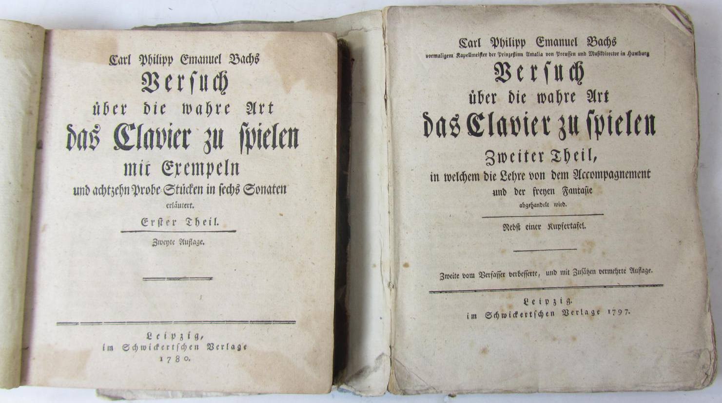 Versuch über die wahre art das Clavier zu spielen. Leipzig: Wschwickertschen Verlage, 1780-97. Volumes 1 and 2 only (of 3), 4to, second edition of volume 1, volume 1 half calf, worn, cover detached, volume 2 with one plate, wrappers, some spotting, worn; Sturms, Christoph C. Geistliche Gesange mit Melodien zum Singen bey dem Claviere. Hamburg: Heroldschen Buchhandlung, 1792. 2 parts in one volume, oblong folio, title vignettes, original boards, some spotting and dampstaining; Beethoven, Ludwig von Sinfonie pour 2 violons, No 5 des Sinfonies. Leipzig: Breithopf & Hartel, [?1825]. 4to, 24 loose parts (some a single sheet), library stamps, some titles soiled, a few tears; Mozart, W.A. Idomeneo, re di Creta. Paris: Maurice Schlesinger & Berlin: A.M. Schlesinger, [c.1822]. 4to, red morocco, some spotting, worn; Mozart, W.A. La clemenza di Tito. Opera seria... aggiustata per il piano forte di A.E. Müller. [Hamburg: G.A. Böhme, c.1800]. Oblong 4to, vocal score, boards, lacks title page, some dampstaining, worn; Mozart, W.A. L'enlevement du serail (Die Entführung aus dem serail). Bonn: Simrock, [c.1799]. Oblong 4to, contemporary half calf, rubbed; Mozart, W.A. Dom Juan oder der Steinerne Gast. No. 42. Bonn: N. Simrock, [c.1797]. Oblong 4to, red half morocco, "Lady Hope, Pinkie House" inscribed on title, lacking pp.111-122 (supplied in early pen facsimile), small tear to title; Mozart, W.A. Partitions des dix principaux quatuors pour deux violins, alto et violoncelle. Offenbach: J. André, [1843]. 8vo, numbers 1-5 only, cloth; and 4 others; sold not subject to return (25)