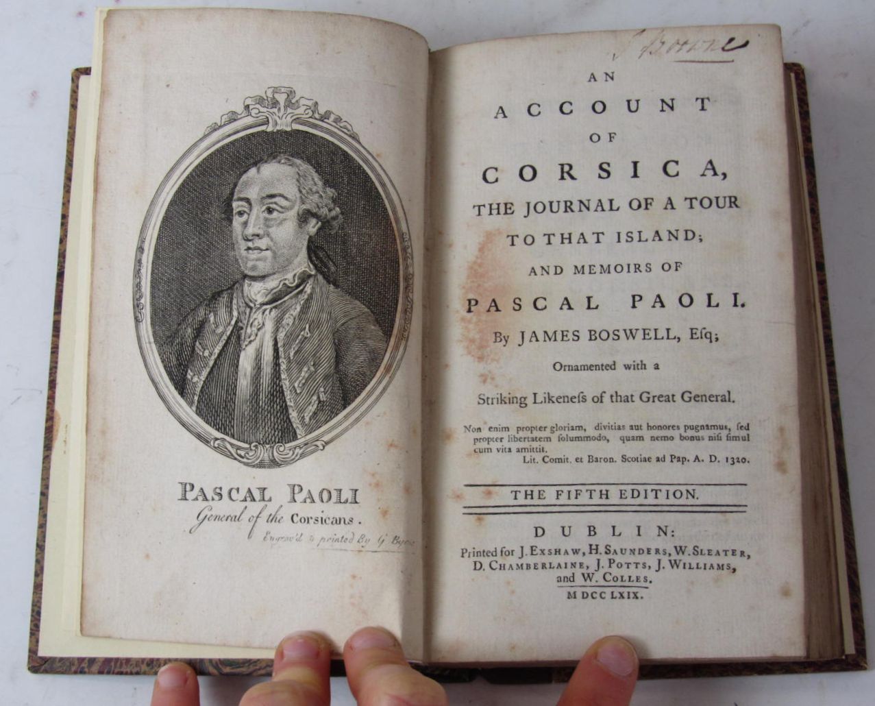 The journal of a tour to the Hebrides with Samuel Johnson... London: Printed by Henry Baldwin for Charles Dilly, 1785. First edition, 8vo., half title and advert leaf at end containing errata and the announcement, "Preparing for the press, in volume quarto, The Life of Samuel Johnson, LL.D." , contemporary tree calf, some rubbing to spine and slight cracking to top joint, very occasional light spotting; [Idem] An account of Corsica... Dublin: J. Exshaw, 1769. 12mo., engraved portrait of Pasco Paoli, modern quarter calf (2)
