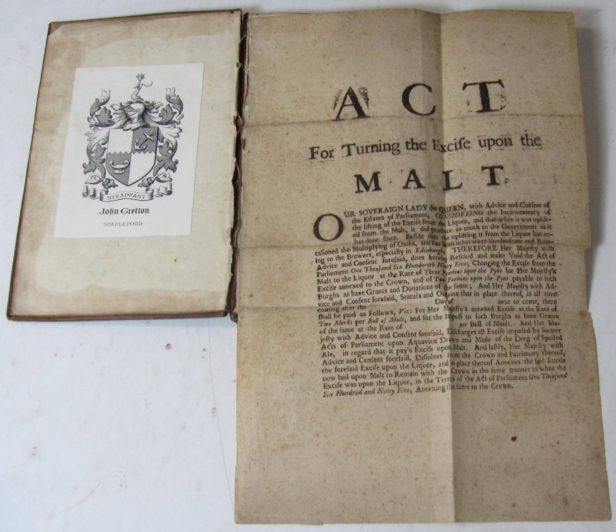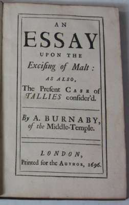 An essay upon the excising of malt... London: printed for the author, 1696. 8vo, folding sheet entitled, Act for Turning the Excise upon the Malt attached to blank, contemporary speckled calf, bookplate attached to paste-down endpaper, some writing and sketches in ink in an early hand to endpapers, folding sheet browned, hinges weak, upper joint splitting, covers slightly rubbed [ESTC R213421] [Wing (2nd edition) B5741]
