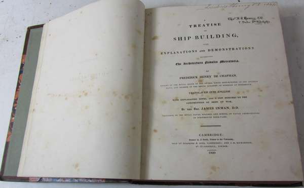 A treatise on ship-building... Cambridge: Deighton & Sons and J.M. Richardson, 1820. 4to, 2 folding tables, 22 folding engraved plates, contemporary half calf, bookplate, spine and covers a little rubbed, some spotting to text and plates