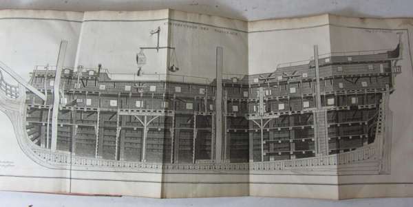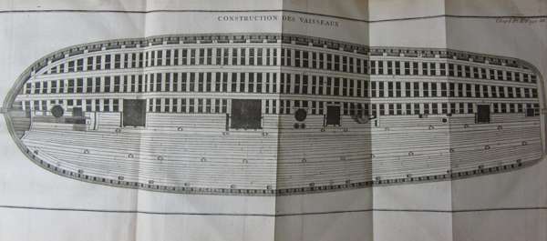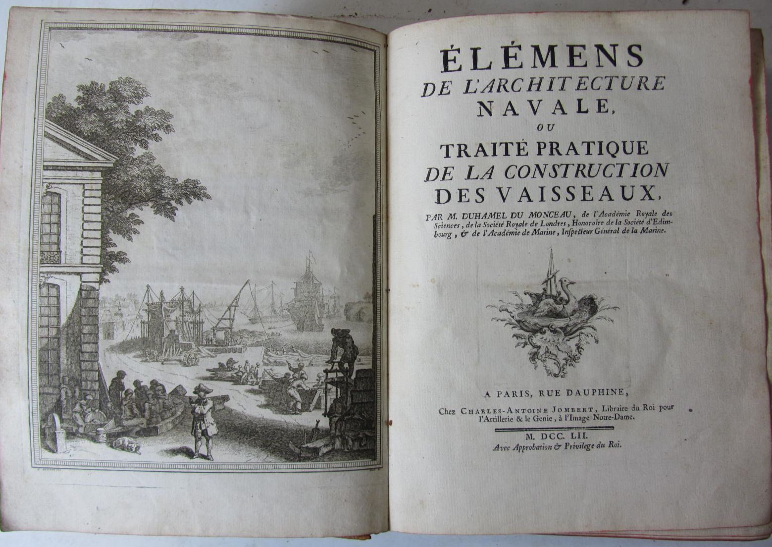 Elémens de l'architecture navale... Paris: Charles-Antoine Jombert (Libraire du Roi pour l'Artillerie & le Genie), 1752. 4to, engraved frontispiece, 24 folding engraved plates on 23 sheets, contemporary calf, calf peeling and removed from some parts of spine, covers a little rubbed and soiled, slight dampstaining, closed marginal tear on page 199, plate 21 torn at join, occasional dust-soiling and spotting