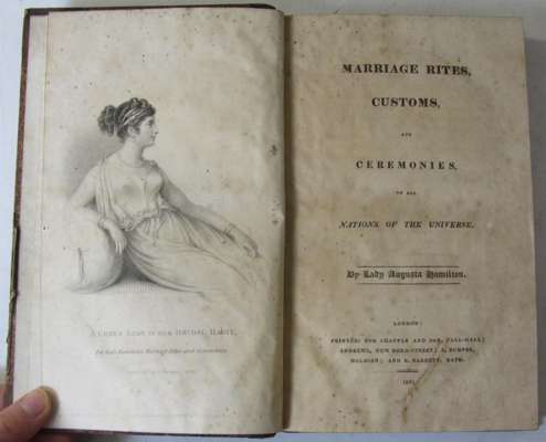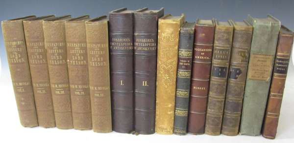 Marriage rites, customs and ceremonies of all nations of the universe. London: Chapple and Son, 1822. 8vo, binding a little rubbed, upper joint cracked, a little darkening; Liddell, Henry The wizard of the north, the vampire bride and other poems. Edinburgh: T. Cadell, 1833. 8vo, contemporary half calf, bookplate of Lord Gretton, a little rubbed; Burney, James History of the buccaneers of America. London: Swan Sonnenschein, 1891. 8vo, contemporary half morocco, bookplate of Lord Gretton, spine a little faded and rubbed; Nicholas, Sir Nicholas Harris The dispatches and letters of Vice Admiral Lord Nelson. London: Henry Colburn, 1845. 8vo, 7 volumes, purple cloth gilt with embossed emblem and motto 'England expects every man will do his duty' to upper covers, bookplates of Lord Gretton, covers and spines faded, occasional spotting; Mill, John Stuart A system of logic... London: John W. Parkrt, 1851. 8vo, 2 volumes, bookplates of Lord Gretton, a little rubbed; Philippart, John Memoirs and campaigns of Charles John... London: C.J. Barrington, 1814. 8vo, original boards, bookplate of Lord Gretton, some slight foxing; Fosbroke, Thomas Dudley Encyclopaedia of antiquities and elements of archaeology. London: John Bowyer, 1840. 8vo, 2 volumes, contemporary half morocco, bookplates of Lord Gretton, some slight spotting; [Lytton, Edward Bulwer, Baron] The pilgrims of the Rhine. [N.p.]: E.I. Roberts, 1834. 8vo, morocco gilt with gilt doubleurs and pink watered silk endpapers, bookplate of Lord Gretton