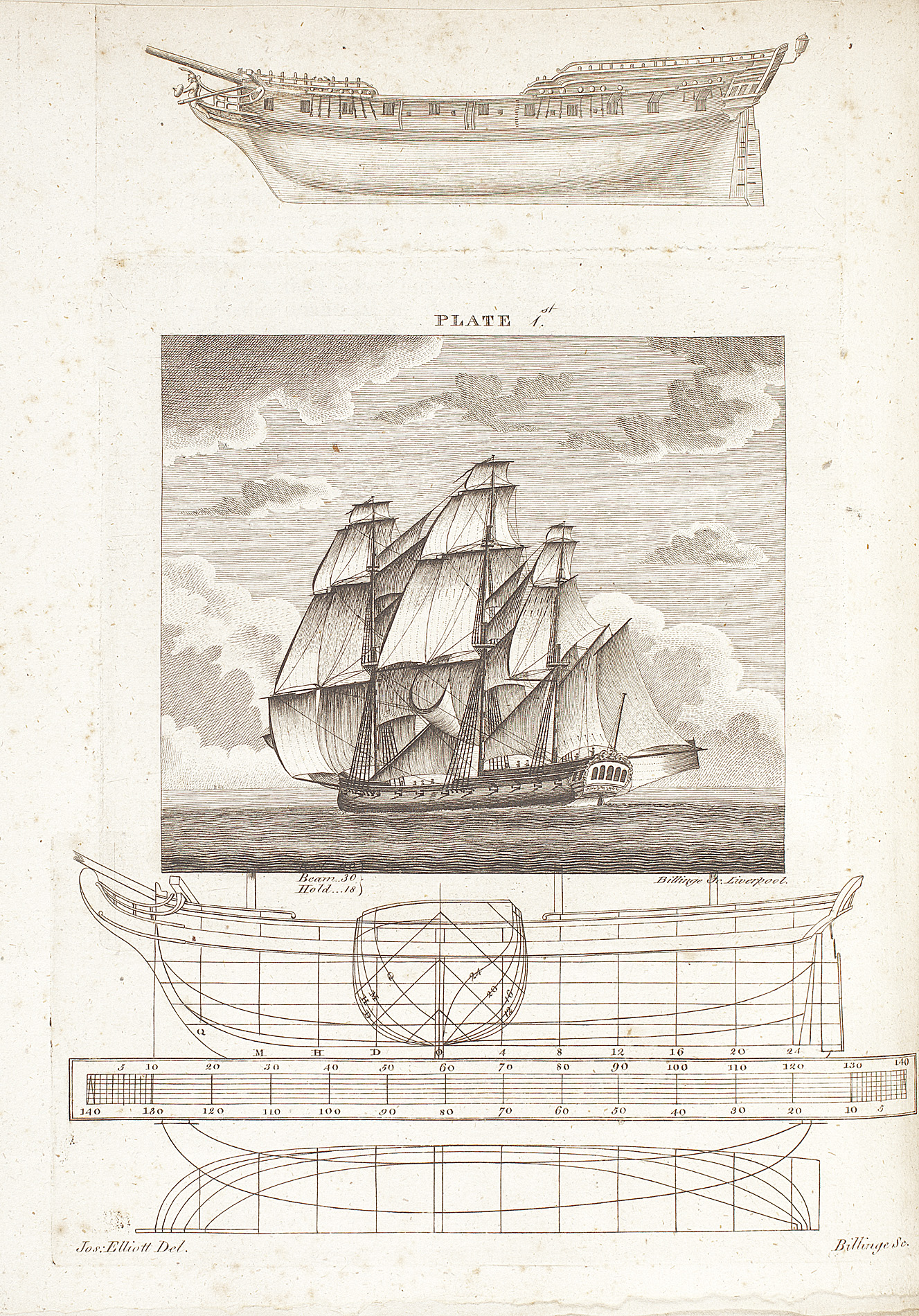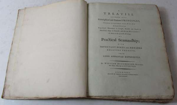 A treatise founded upon philosophical and rational principles...of merchant's ships in general, and... practical seamanship... Liverpool: Thomas Billinge, 1791. 4to, 13 plates (one folding), contemporary half calf, bookplate, very rubbed, joints splitting, spine a little chipped, some slight dust-soiling and foxing, mostly marginal [ESTC T99499]