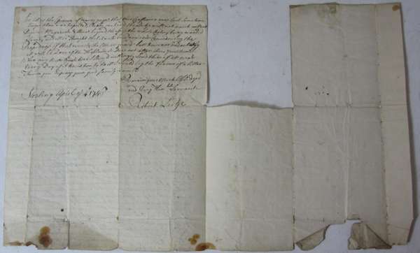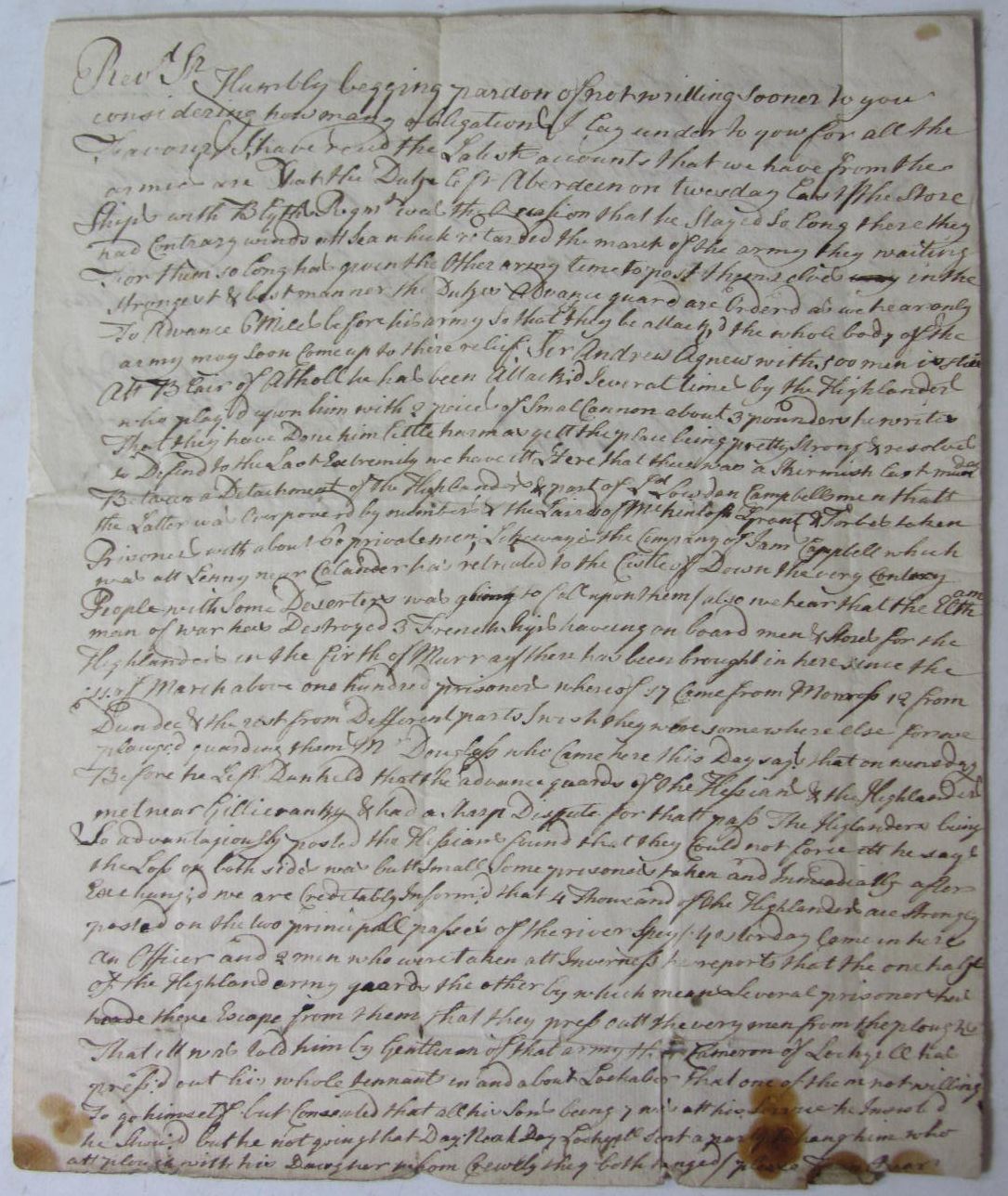 Letter written by Robert Lecke in Stirling on 4th April 1746, twelve days prior to the Battle of Culloden, giving some account of the Highland Uprising taking place under the leadership of Prince Charles Edward Stuart, including information such as: "Sir Andrew Agnew with 500 men is still at Blair of Atholl, has been attacked several times by the Highlanders who played upon him with 2 pieces of small cannon about 3 powders..." and other details of skirmishes, taking prisoners and shipping, 4 pages (writing on 2 pages), each page 18.5x22.5cm, section lacking from second leaf with no loss of text, some slight dust-soiling and spotting, a couple of very small holes where paper has been folded with loss of a couple of letters, transcription available