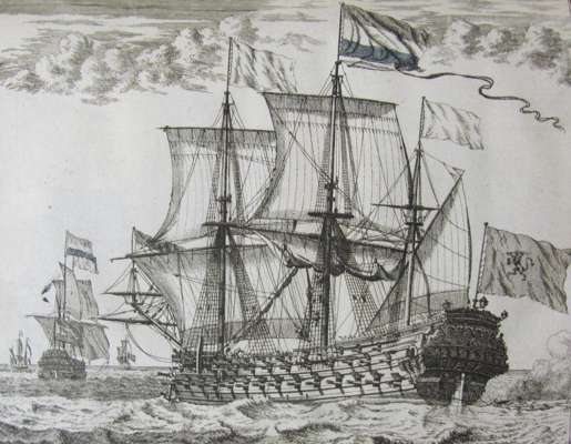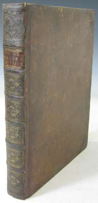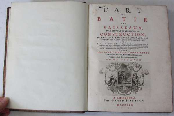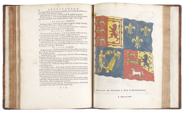 L'art de batir les vaisseaux... Amsterdam: David Mortier, 1719. 4to, 2 volumes in one, title in red and black with engraved vignette, 22 engraved plates, mostly plain with occasional blue coloured areas and 90 plates showing flags with hand-colouring (112 plates in total), half-titles, contemporary calf, bookplates of John Frodsham, Egerton Leigh, and Lord Gretton, spine neatly rebacked, covers a little rubbed, some slight dampstaining to outer margins of a few pages, small amount of repair work to some inner margins with no loss of text, 'Frodsham' plate loose, small stain to title