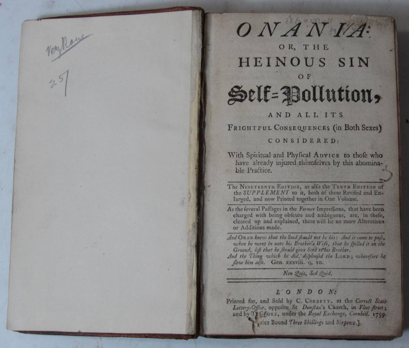 Or the heinous sin of self-pollution, and all its frightful consequences (in both sexes) considered: with spiritual and physical advice to those who have already injured themselves by this abominable practice. London: C. Corbett, 1759. 8vo, contemporary calf, later spine, a little rubbed, title, preface and initial 8 pages wormed with loss of a few letters, some slight soiling [ESTC N11811]