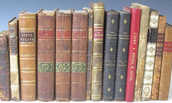 The life of Mr. Rich. Hooker. London: Rich. Marriott, 1665. First edition, 8vo, contemporary calf, signature of He. Carrington on title and ?later inscription "Tanquam Explo. Charles Cotton " at end on p. 209, covers detached, spotting and soiling, lacks frontispiece portrait, [Wing W670; ESTC R10749]; [Charles, Leslie] Cassandra. (But I hope not). London, 1705. 4to, disbound; Pliny An address of thanks to a good prince. London: T. Fickus & W. Hart, 1686. 8vo, translated by William Kennett, lacking dedication (supplied in manuscript) and portrait, lacks spine, spotting; [Castera, J.H.] The life of Catharine II, Empress of Russia. London, 1799. 3 volumes, 8vo, contemporary tree calf' Fortescue, Sir John The difference between an absolute and limited monarchy. London, 1714. 8vo, ruled in red throughout, title printed in red and black, contemporary calf, neatly rebacked; [Paxton, P.] Civil polity. A treatise concerning the nature of government. London, 1703. 8vo, recent half calf, slightly browned, title with library stamp & repaired in inner margin; Forsyth, J.S. The antiquary's portfolio. London, 1825. 2 volumes, 8vo, frontispieces, black half morocco, t.e.g.; [Williamson, John] A treatise on military finance. London, 1800. 12mo, [Copac, only 1 copy of this edition], contemporary sheep, rubbed; [Mancini, F.] Hydaspes. An opera. London, 1712. 8vo, disbound; [Hailes, Lord] The address of Q. Sept. Tertullian to Scapula Tertullus. Edinburgh, 1790. 12mo, original boards, uncut; boards slightly soiled; Fordyce, William Memoirs concerning Herculaneum. London, 1750. 8vo, disbound; and 8 others (22)