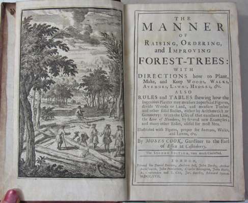 The manner of raising, ordering and improving forest-trees. London: Daniel Browne, Andrew Bell, John Darby, Arthur Bettesworth... 1717. Second edition, 8vo, engraved frontispiece, 4 plates on 2 folding sheets, contemporary panelled calf, bookplate of Lord Gretton, rubbed, some dampstaining [ESTC T38948]