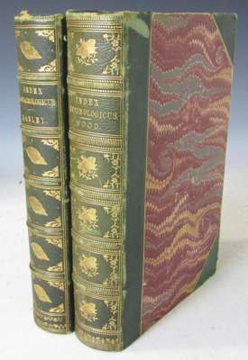 Index entomologicus, or, a complete illustrated catalogue containing ... the lepidopterous insects of Great Britain. London: G. Willis, 1854. 8vo, 59 hand-coloured plates, contemporary green half morocco, bookplate of James Milnes Stansfield, spine and corners a little rubbed, some very occasional light marginal spotting; [Idem] Index testaceologicus, an illustrated catalogue of British and foreign shells... London: Willis and Southeran, 1856. 8vo, 46 hand-coloured plates, contemporary green half morocco, spine with gilt tooled shell patterns, t.e.g., bookplate of James Milnes Stansfeld, very slightly rubbed (2)