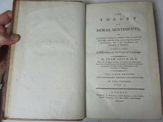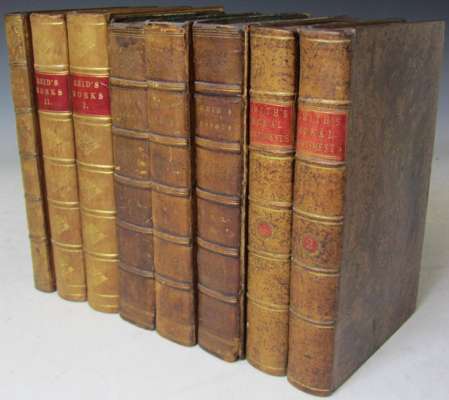 The theory of moral sentiments London: A. Strahan, 1790. Sixth edition, 2 volumes, 8vo, contemporary tree calf, spines a little faded and slightly cracked, previous owners' bookplate and signature to endpapers; Reid, Thomas Essays on the powers of the human mind... Edinburgh: Bell and Bradfute, 1819. 8vo, 3 volumes, contemporary half calf, previous owner's bookplate to endpapers, spines and bindings rubbed, joints split, slight spotting; [Idem] Works. Edinburgh: Maclaughlan and Stewart, 1872. Seventh edition, 8vo, 2 volumes, later calf gilt with embossed arms of Aberdeen University, spines a little rubbed, previous owner's bookplates and signatures to endpapers, endpapers a little spotted; binding of volume 1 very slightly marked; Burke, Edmund A philosophical enquiry into the origin of our ideas of the sublime and beautiful... London: A. Robertson & Co., 1824. 8vo, later calf gilt with Greek and Latin embossed inscriptions, previous owner's bookplate to paste-down endpaper, slight spotting, spine a little rubbed and faded, some light markings to binding (8)