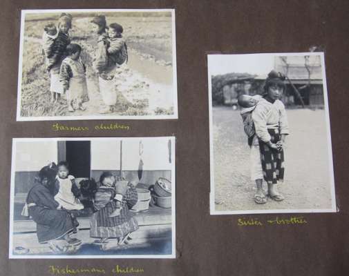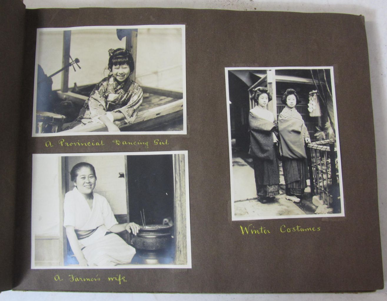 A set of 5 albums containing over 570 silver? prints showing various aspects of life in Japan in the 1920s, first book contains manuscript title in yellow paint reading, B.H. Winder, Kamakura, Japan, 3rd April 1920, Camera = Carbine (plate attachment), Lens= Cooke, photographs include images of adults and children at work, silk manufacture, children, Geisha or dancing girls and young trainees, and religious ceremonies, a few of the photographs appear to be copies, large number of images captioned, a few slightly silvered or faded, albums covered in green silk, faded and worn several covers detached (5)