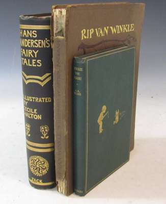 Fairy tales, illustrated by Cecile Walton. London: T.C. & E.C. Jack, 1911. 8vo, coloured frontispiece, 23 coloured plates, original blue cloth gilt with gilt image of mother and child reading on cover, golden and black patterned endpapers, covers and spines a little rubbed; Irving, Washington Rip van Winkle, illustrated by Arthur Rackham. London: William Heinemann, 1916. 4to, coloured frontispiece, 17 (of 23) coloured plates, original boards, covers slightly faded in places, spine chipped, endpapers foxed; Milne, A.A. Winnie-the-Pooh. London: Methuen & Co., 1926. First edition, 8vo, original green cloth gilt; Robinson, F. Cayley, illustrator The book of Genesis. London: Philip Lee Warner, 1914. 4to, number 372 of 500 copies, 10 coloured mounted plates, original buckram-backed boards, t.e.g., uncut, dustwrapper, boards lightly discoloured (4)