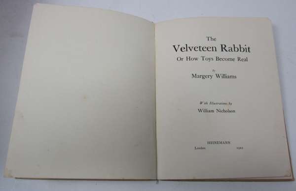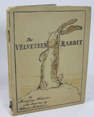 The velveteen rabbit. London: Heinemann, 1922. First edition, 8vo, illustrated by William Nicholson, half title, 7 colour plates, pictorial endpapers, original pictorial boards, chipping and some loss to the backstrip, corners bumped, pencil and large modern ink ownership inscription to half title
