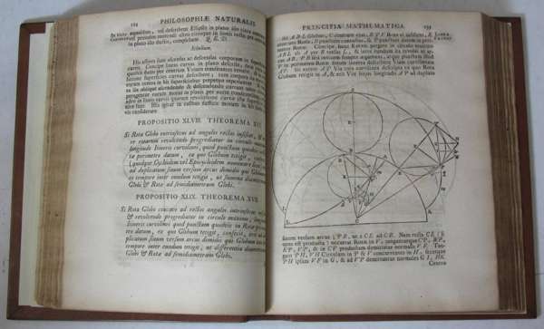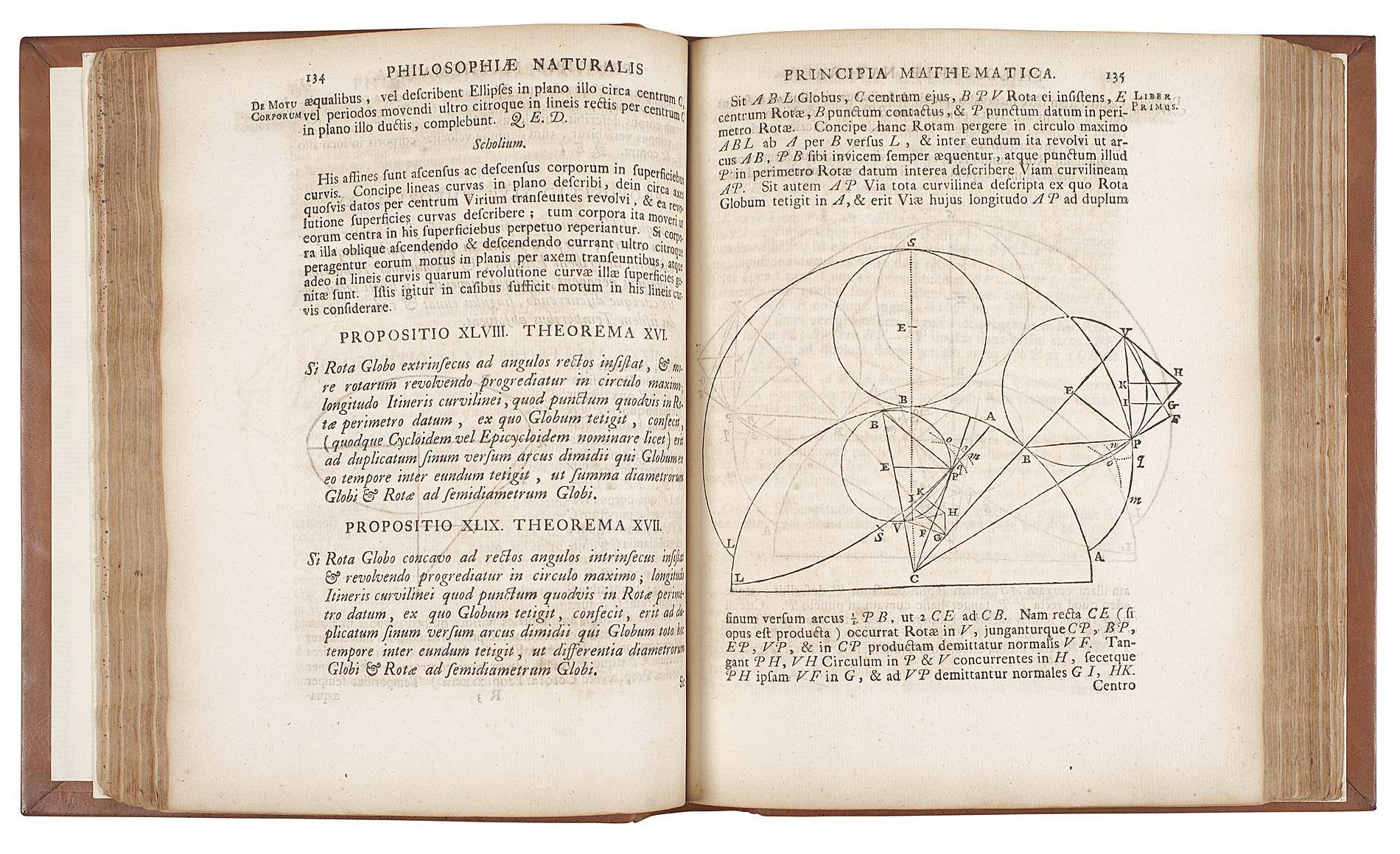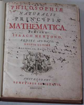 Philosophiae naturalis principia mathematica. Amsterdam: Sumptibus Societatis, 1714. 4to, folding plate, 20th century panelled calf, slight fading to spine, heavy ink annotations in an early hand to several pages including title with show-through, some foxing, mainly marginal, some dust-soiling and ink stains to title, title sensitively repaired along inner margin