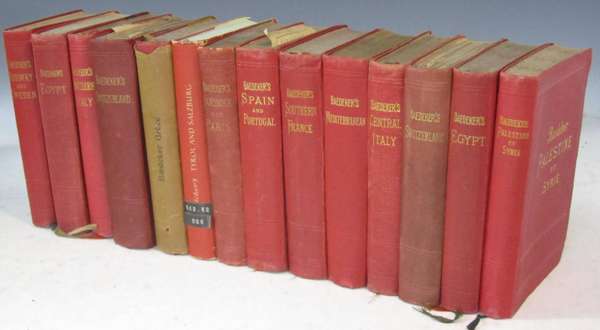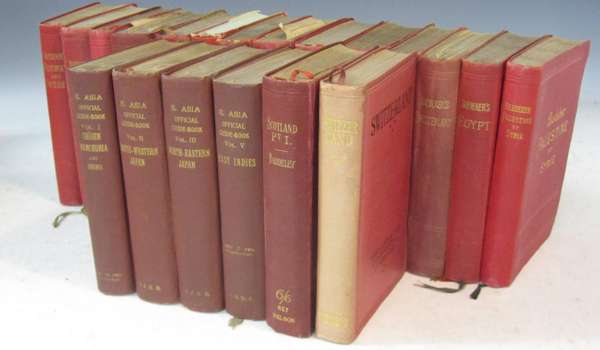 Egypt and the Sudan. Leipzig: Karl Baedeker, 1908. Sixth (English) edition, 8vo, maps and plans, original red cloth gilt, very slight occasional spotting, cloth slightly faded, edges a little bumped; [Idem] Palestine et Syrie. Leipzig: Karl Baedeker, 1906. Third (French) edition, 8vo, maps and plans, original red cloth gilt, spine slightly bumped and faded; and 12 other Baedeker guides covering Europe (full list avaliable upon request); Japanese Department of Railways An official guide to Eastern Asia... Tokyo: The Department of Railways, 1914 (volumes 2 and 3) - 1920 (volumes 1 and 5). Volumes 2 and 3 first edition, volumes 1 and 5 second edition, 8vo, 4 volumes, lacking volume 4, maps and plans, red cloth gilt, some maps slightly torn, spines a little bumped and faded, contents in volume 1 partially obscured with tape, one plate lacking in volume 3; And two others (20)