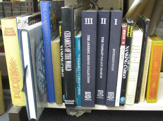 Misugi, T. Chinese porcelain collection in the Near East, Topkapi and Ardebil. Hong Kong: Hong Kong University Press, 1981. First English edition, 3 volumes, original cloth; Schmidt, Robert Chinesische keramik von der Han-zeit bis zum XIX. jahrhundert. Frankfurt: Frankfurter Verlags-Anstalt, 1924. 4to, 131 (of 132) plates (11 coloured), original cloth, slight soiling to cloth, spine a little bumped and faded, no dust-jacket, plate 13 (coloured) lacking; Fehérvári, Géza Ceramics of the Islamic world in the Tareq Rajab Museum. London: I.B. Tauris, 2000. Original black cloth with dust-jacket slightly chipped; Ayers, John Far Eastern ceramics in the Victoria and Albert Museum. London: Sotheby Parke Bernet, 1980. First English language edition, folio, blue cloth gilt, dust jacket a little chipped with faded spine; Scheurleer, D.F. Lunsingh Chinese export porcelain, Chine de commande. London: Faber and Faber, 1974. 4to, 42 pages of greyscale plates, colour frontispiece, 6 (of 7) colour plates, original covers, laminated, slightly soiled with small gouge to base of spine; and 10 others (17)
