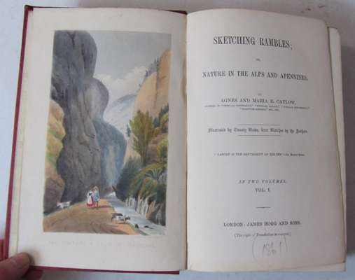 Sketching rambles or nature in the Alps and Apennines. London: James Hogg and Sons, [1861]. 8vo, 2 volumes, 2 coloured lithographed frontispieces, 18 tinted lithographs, original red cloth gilt, bindings a little soiled and faded, edges dust-soiled, a few pages coming loose