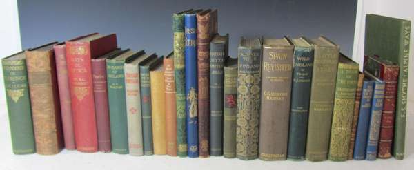 Williams, H.W. Select views in Greece. London, 1892. 4to, 2 volumes in 1, engraved title and 63 (of 64) plates, original blue cloth, covers a little soiled, spine slightly faded, hinges splitting, interior very clean; Chapman, Abel Wild Norway. London, 1897. 8vo, frontispiece, 16 plates, modern black cloth with gilt lettering, spine a little faded; Boys, Edward Narrative of a captivity and adventures in France and Flanders. London, 1831. Second edition, 8vo, 8 engraved plates, contemporary half morocco, bookplate of James Milne Stansfield, frontispiece lacking, pages 23-24 lacking, some pages and plates loose, spotting, binding rubbed, upper joint cracked; Hall, Samuel Carter Ireland... London, 1841-1843. 4to, 3 volumes, 3 frontises, 3 engraved titles, 18 maps and 46 engraved plates, contemporary morocco gilt, spines rubbed, a little foxing; Lanciani, Rodolfo New tales of old Rome. London, 1901. 8vo, plates, red cloth with gilt lion knocker motif to upper cover; James, Edith E. Coulson Bologna, its history, antiquities and art. London, 1909. 8vo, folding map at rear, original blue cloth gilt, spine a little bumped and faded; Barker, Edward Harrison Two summers in Guyenne. London, 1894. 8vo, brown cloth gilt, library sticker to upper cover, hinges weak, covers and spine a little rubbed; Warne, Frederick Picturesque England. London, 1891. 8vo, 6 colour plates, original red pictorial and gilt cloth, spine a little faded and bumped, lower joint splitting; Stewart, Hugh and Haenen, F. De Provincial Russia. London, 1913. 8vo, 32 plates (16 in colour), original red cloth gilt, spine faded; Washburn, Claude C. Pages from the book of Paris. 8vo, plates, original cloth with paste-down panel showing a young woman and two gentlemen, covers soiled; and a quantity of others