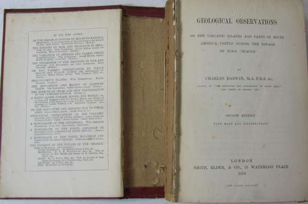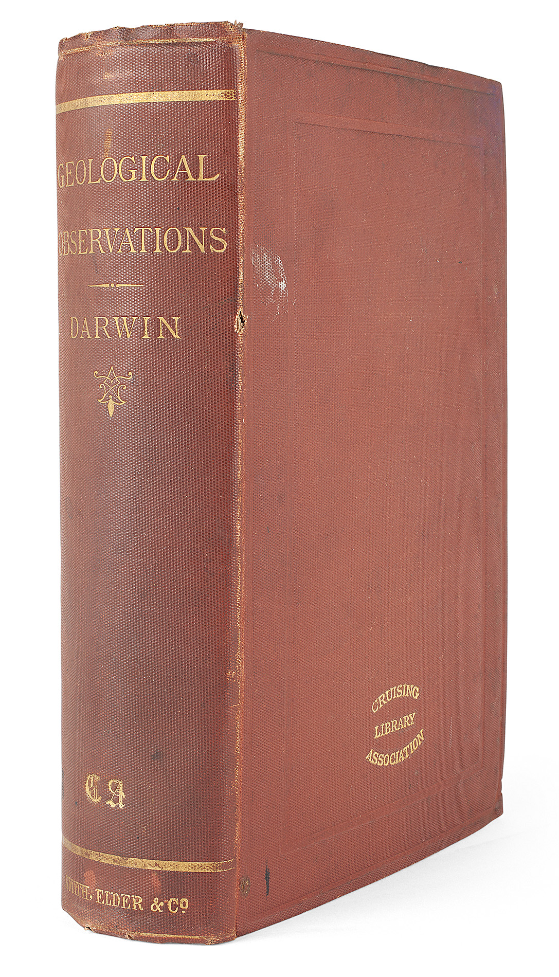 Geological observations on the volcanic islands and parts of South America visited during the voyage of H.M.S. Beagle. London: Smith, Elder & Co., 1876. Second edition, 8vo, 2 folding maps, 5 folding plates, upper hinge broken, Cruising Association Library gilt stamp to upper cover, "C.A." to spine, book label, and oval blindstamp to title, slight spotting, small tear to folding map without loss