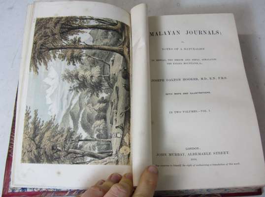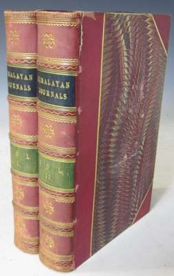 Himalayan journals, or notes of a naturalist. London: John Murray, 1854. 8vo, 2 volumes, tinted lithographic frontispieces, 11 tinted lithographic plates (of 12, plate 9 lacking), 2 folding maps, contemporary half calf, bookplate of E. Hay Stansfeld, bindings a little rubbed, map in volume 2 foxed, small tear to page 206 in volume 1 with slight loss of engraving, closed tear to plate in volume 2 with no loss (2)