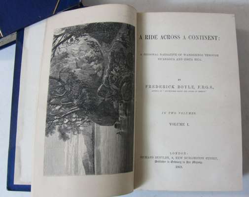 A ride across a continent: a personal narrative of wanderings through Nicaragua and Costa Rica. London: R. Bentley, 1868. First edition, 2 volumes, 8vo, 2 frontispieces and 3 plates, contemporary half calf, morocco labels, spine gilt