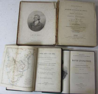Travels in the interior districts of Africa. London: for the author, 1799. First edition, 4to, engraved portrait frontispiece, 3 folding maps and charts and 5 plates, title and frontispiece detached, calf, lacks lower board; Cooley, William Desborough Inner Africa laid open, in an attempt to trace the chief lines of communication across that continent south of the Equator. London: Longmans &c., 1852. 8vo, folding map, original cloth, 32pp. advertisements at end, some spotting; Livingstone, David Voyage d'exploration au Zambèze et dans l'Afrique Centrale 1840-1873. Paris: Hachette, 1882. Third edition, 8vo, frontispiece, illustrations, original cloth (3)