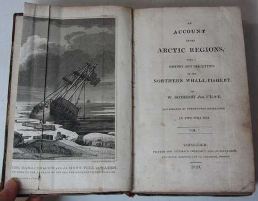 An account of the Arctic regions... Edinburgh: Archibald Constable, 1820. First edition, 8vo, 2 volumes, 2 folding engraved frontispieces, 4 folding tables, 21 (of 22) maps and plates (some folding), contemporary half calf, boards rubbed, joints cracked, spines rubbed and cracked, some spotting and dust-soiling, small hole to frontispiece in volume 1, frontispiece in volume 2 torn, small hole to page 573 in volume 2 with loss of several letters (2)