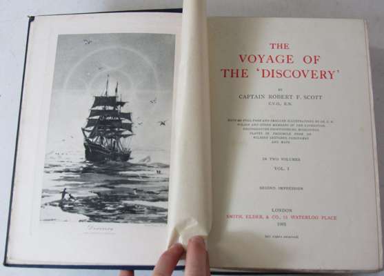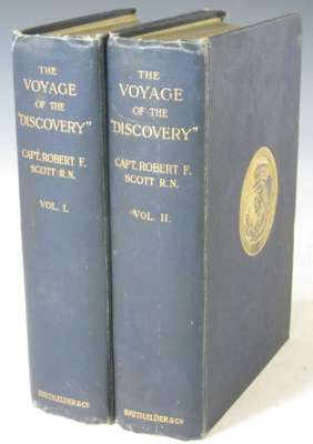 The voyage of the 'Discovery'. London: Smith, Elder, & Co., 1905. First edition, 8vo., 2 volumes, 2 photograveure frontispieces, 12 colour plates, 2 folding maps in rear pockets, original blue cloth gilt with gilt medallions to upper covers, spines a little faded, rubbed and bumped (2)