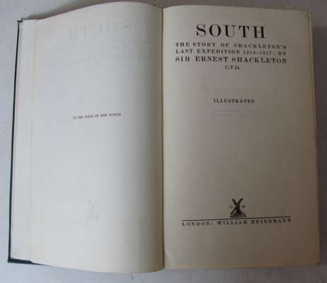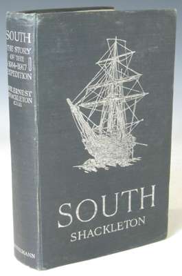 South, the story of Shackleton's last expedition 1914-1917... London: William Heinemann, 1919. First edition, second impression, 8vo, coloured frontispiece, 87 photographic plates, folding map, original cloth with silver figure of a ship to upper cover, ends of spine and corners a little bumped, some occasional very light marginal spotting, closed marginal tear to map