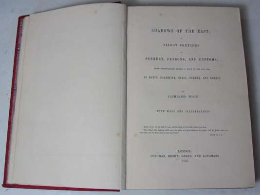 Shadows of the East, or slight sketches of scenery, persons and customs... London: Longman, Brown, Green and Longmans, 1855. 4to, 17 tinted lithograph plates and 2 coloured maps, with an envelope containing two signed letters from the author to Mrs Howard of Corby Castle, original red cloth with arabesque gilt designs to covers and spine, floral endpapers, g.e., spine a little faded and frayed at ends, covers very slightly soiled, upper hinge split, occasional spotting, full transcriptions of letters available upon request