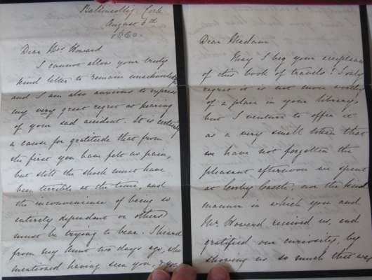 Note: Tobin's book contains two letters written on mourning paper, from the author to Mrs Howard of Corby Castle. The first letter, marked in pencil as being dated 1860, offers the author's regards for Mrs Howard's health. Tobin also gives a remarkably equanimous account of her 21-year-old son's death and mentions the family's next planned trip to Egypt and Syria. The second letter, dated 1861, offers a copy of Shadows of the East to Mrs Howard.