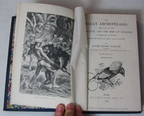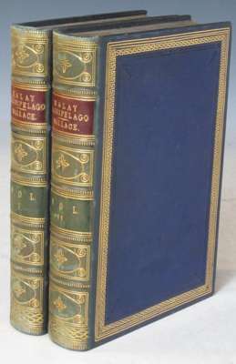 The Malay archipelago... Macmillan and Co., 1869. Second edition, 8vo, 2 frontispieces, 1 folding map (of 2), 8 engraved plates, contemporary blue calf gilt, bookplates of James Milne Stansfeld, spines faded, interiors clean (2)