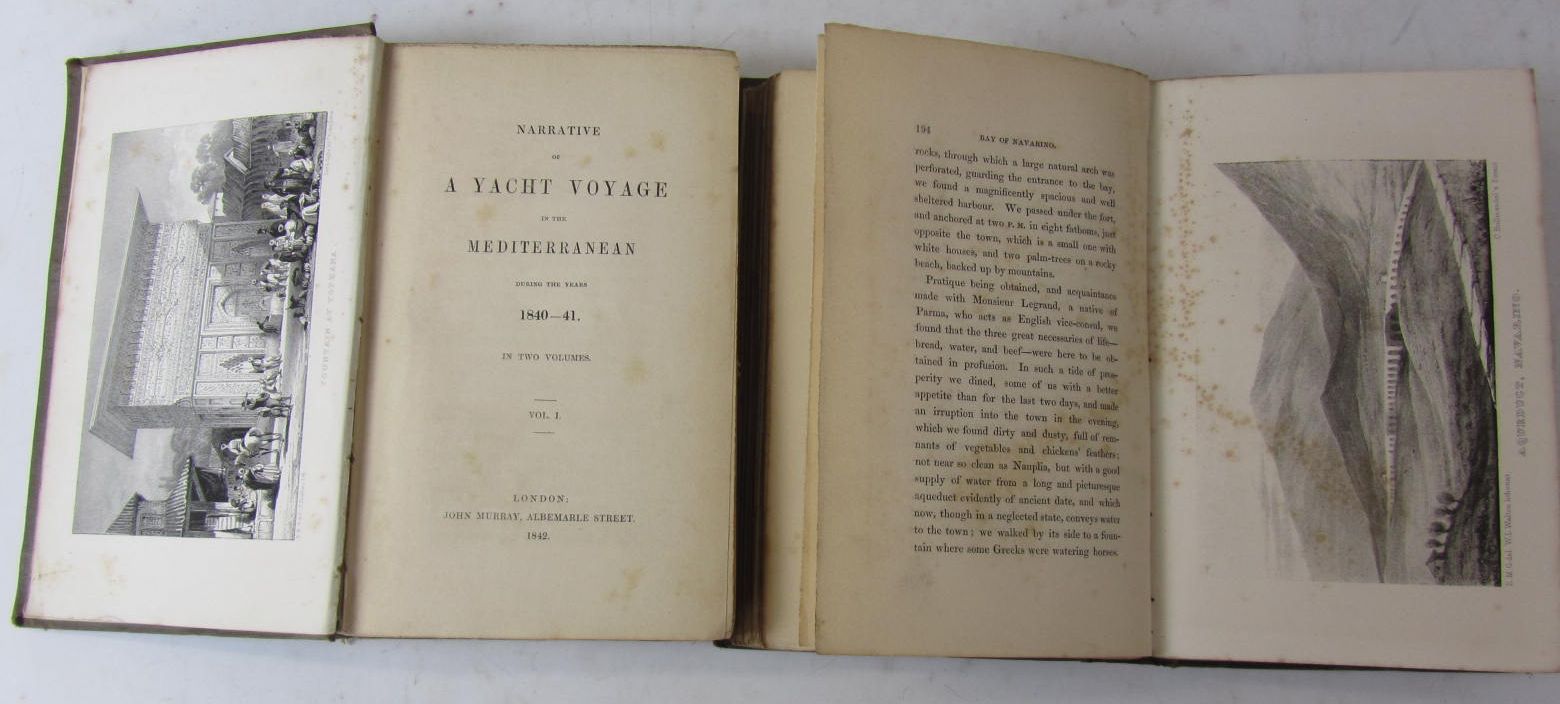 Narrative of a yacht voyage in the Mediterranean. London, J. Murray, 1842. 2 volumes, 8vo, 26 plates, original cloth, spotting, dampstaining to a few plates, hinges weak, a bit rubbed and soiled