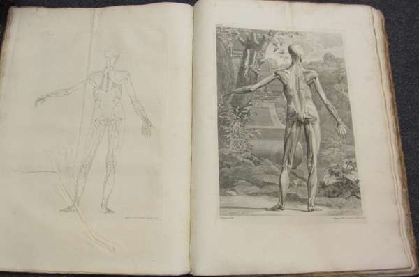 Tables of the skeleton and muscles of the human body. London: J. & P. Knapton, 1749. Large folio, engraved title vignette, 28 engraved plates and 12 outline plates, title page detached and dust-soiled; [bound with] A compleat system of the blood-vessels and nerves. London: John Knapton, 1758. Engraved title vignette, 7 engraved plates and 4 outline plates, 1 plate torn in half, but complete, 2 parts in one volume, contemporary half calf, uncut, RCSI library stamps to text and plate versos, slight dampstaining in lower margins, a few spots, a few short marginal tears, very worn