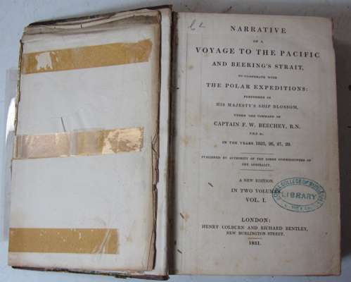 Narrative of a voyage to the Pacific... London: Henry Colburn and Richard Bentley, 1831. First edition, 8vo, 2 volumes, 23 engraved plates, 3 maps (2 folding), contemporary quarter calf, upper cover of volume 2 detached, some parts of spines lacking, joints split, rubbed, RCSI library stamps, occasional foxing, a few tears to maps and plates (2)