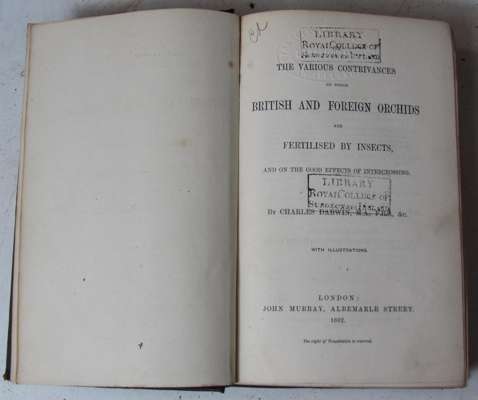 The various contrivances by which British and foreign orchids are fertilised by insects. London: John Murray, 1862. First edition, 12mo, folding plate, original? maroon cloth gilt by Edmonds and Remnants, London, a little rubbed, RCSI library stamps
