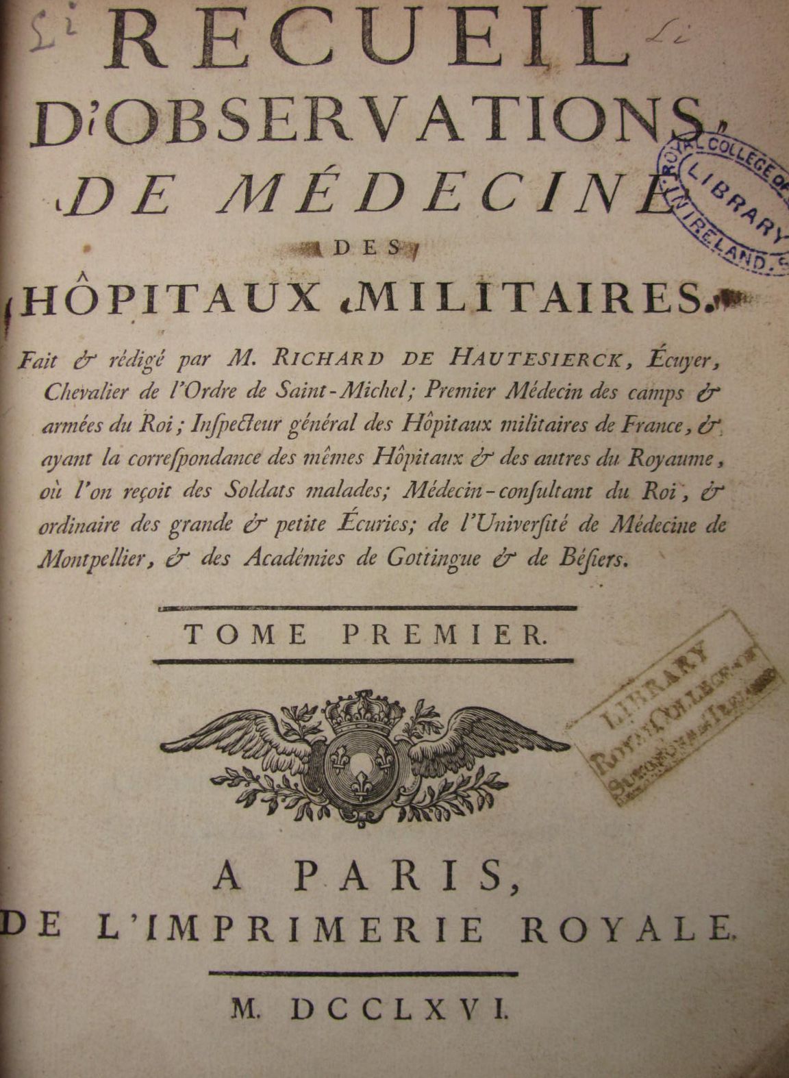 Mémoires de chirurgie, Londres & Paris, 1768. 2 volumes, 4to, 24 erratically numbered plates (complete), some folding, recent half calf, uncut, half-titles, intermittent dampstaining, RCSI library stamp on titles; Tenon, Jacques R. Mémoires sur les hôpitaux de Paris. Paris: P.D. Pierres, 1788. 4to, 15 folding engraved plates, 2 folding tables, calf, lacks spine and lower board; Courtial, J.J. Nouvelles observations anatomiques sur les os. Paris: L. d'Hourny, 1705. 12mo, contemporary calf, worn, upper cover detached; Courcelles, D.C. Manuel des operations les plus ordinaires de la chirurgie. Brest: R. Malassis, 1756. 8vo, contemporary calf, browned, worn; Hautesierck, Richard de Recueil d'observations de médecine des hôpitaux militaires. Paris: l'Imprimerie Royale, 1766. 4to, volume 1 only, contemporary calf, worn; Cuvier, Baron Rapport historique sur les progres des sciences naturelles depuis 1789. Paris: l'Imprimerie Impériale, 1810. 4to, half calf, covers detached; all with RCSI library stamp on title, some spotting, occasional dust-soiling, most rubbed or worn; sold not subject to return
