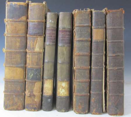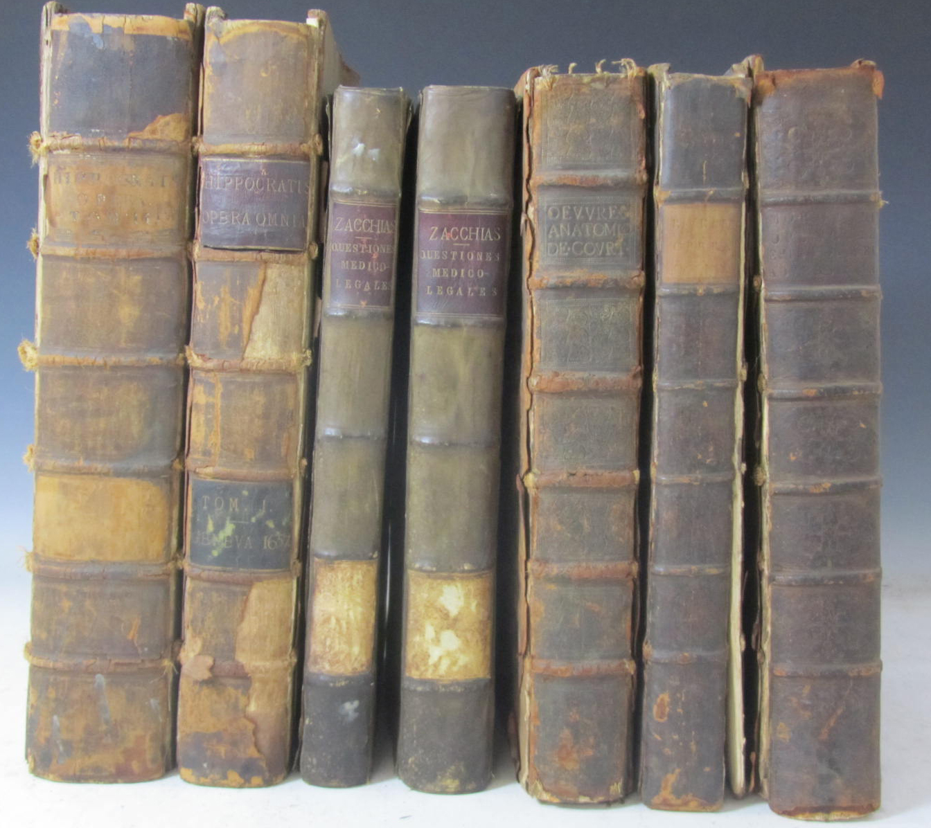 Hippocratis medicorum omnium facile principis, opera. Geneva: S. Chouet, 1657. Folio, 1 volume bound in 2, calf, worn, two covers detached; Courtin, Germain Les oeuvres anatomiques et chirurgicales. Rouen: F. Vaultier & L. de Mesnil, 1656. Folio, contemporary calf, worn; Rivière, Lazare Opera medica universa. Lyon: A. & J. Posuel, 1698. Folio, title printed in red and black, slight marginal worming, contemporary calf, upper cover detached; Zacchia, Paolo Quaestionum medico-legalium. Lyon: A. & J. Possuel, 1701. 3 volumes in 2, titles printed in red and black, original vellum; Morgagni, G.B. Opuscula miscellanea. Venice, 1763. Volume 1 only, folio, 3 engraved plates, calf, covers detached; all with RCSI library stamp on titles, all spotted, some dust-soiling, all calf, worn; sold not subject to return (7)