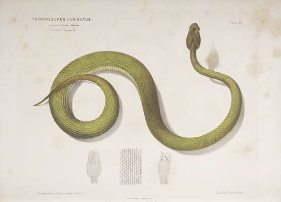 The thanatophidia of India being a description of the venemous snakes of the Indian peninsula. London: J. & A. Churchill, 1872. First edition, large folio, presentation copy inscribed on half title "WIth Dr. Fayrer's compliments", RCSI library stamp on title and several leaves of text, 31 plates, 28 chromolithographed, 2 double-page, original red cloth, slightly spotted, hinges weak