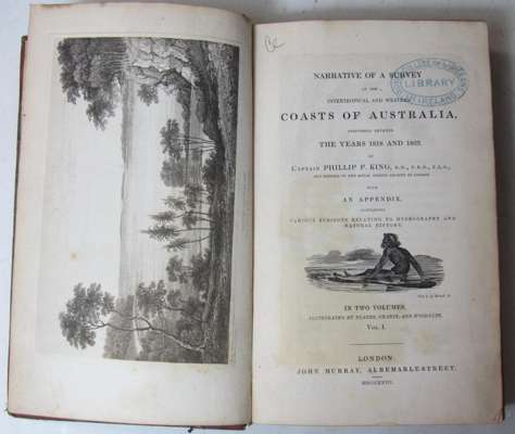 Narrative of a survey of the intertropical and western coasts of Australia. Performed between the years 1818 and 1822. London: John Murray, 1827. First edition, 2 volumes, 8vo, 13 plates, 1 (of 2) folding charts (lacks chart of Port Cockburn, vol.2), illustrations, contemporary half calf, RCSI library stamp to titles, some spotting and minor dust-soiling, lacks half-titles, slightly rubbed