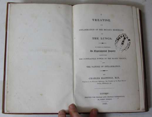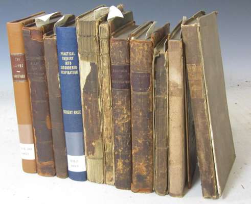 Ellis, Daniel Farther inquiries into the changes induced on atmospheric air by the germination of seeds... Edinburgh: W. Blackwood, 1811. 8vo, contemporary half calf, joints cracked, rubbed, library stamps, some darkening and spotting to pages; Hastings, John On the special treatment of pulmonary consumption and whooping cough. London: Samuel Highley, 1854. 8vo, coloured frontispiece, contemporary gilt cloth, joints cracked, some fading to spine and covers, some spotting; Hastings, Charles A treatise on in inflammation of the mucous membrane of the lungs. London: T. & G. Underwood, 1820. 8vo, modern half calf, occasional foxing, library stamps; Scudamore, Sir Charles Cases illustrating and confirming the remedial power of the inhalation of iodine and conium in tubercular phthisis. London: Longman [&c.], 1834. 8vo, original boards and label, upper cover detached, very slight occasional dust-soiling; Baron, John Illustrations of the enquiry respecting tuberculous diseases. London: T. and G. Underwood, 1822. First edition, 8vo, contemporary half calf, covers detached, spine lacking, occasional foxing, plates lacking, library stamps; Badham, Charles An essay on bronchitis... London: J. Callow, 1814. 8vo, original boards(?), covers detached, library stamps; Bostock, John An essay on respiration. Liverpool: J. McCreery, 1804. 8vo, one engraved plate, contemporary tree calf, upper cover detached, lower joint split, some spotting, tears to a few pages with loss of several words on p.161; and 4 others; sold not subject to return (11)