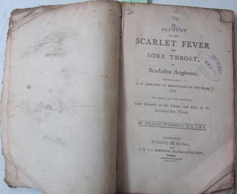 An account of the scarlet fever and sore throat, or scarlatina anginosa. Birmingham: G.G. & J. Robinson, 1793. Second edition, 8vo, original wrappers, uncut, wrappers dust-soiled and frayed, one loose, RCSI library stamps on title, some margins dust-soiled or creased, "Withering" written on upper wrapper