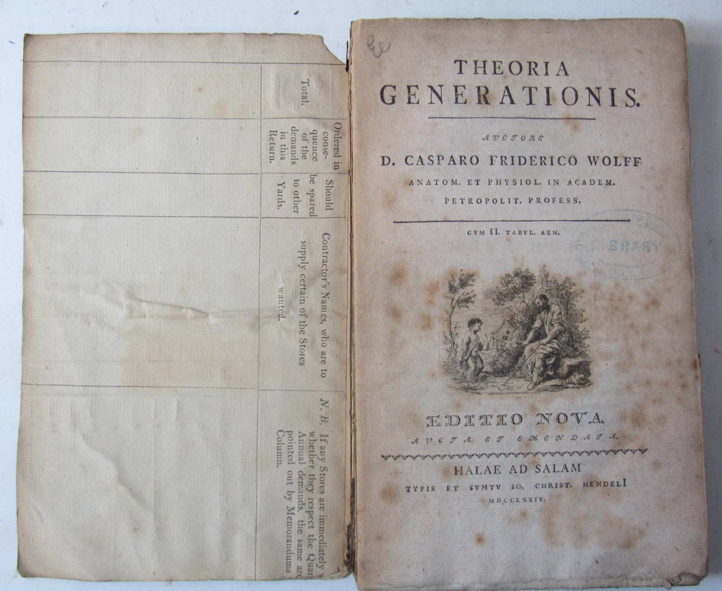 Theoria generationis.. editio nova aucta et emendata. Halle: C. Hendel, 1774. 8vo, 2 folding engraved plates, original wrappers, uncut, RCSI library stamp to title, some spotting