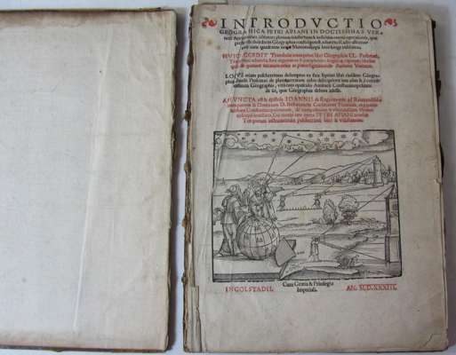 Introductio geographica... in doctissimas verneri annotationes. Ingolstadt, 1533. 8vo, woodcut on title and in text, eighteenth century calf, final two leaves torn with loss of text, cut close at head throughout, two headlines cropped with loss, some spotting and soiling, very worn, covers detached, title slightly soiled and slight loss of corners