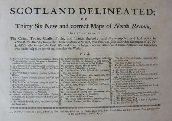 Scotland delineated or thirty six new and correct maps of North Britain. London: Thomas Bowles, 1745. Oblong folio, 2 folding maps and 34 engraved county maps, hand-coloured in outline, nineteenth century half calf