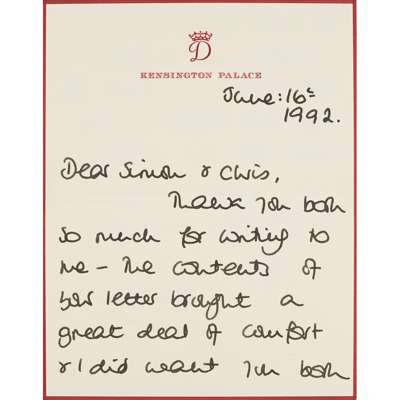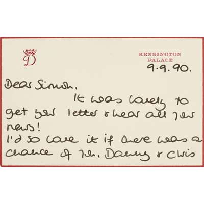 AUTOGRAPHED LETTER SIGNED, KENSINGTON PALACE, TO SIMON [BARNES] AND CHRIS