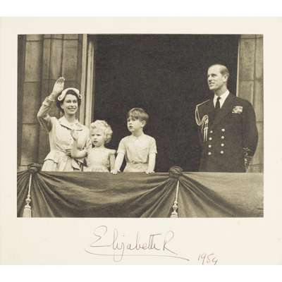 CHRISTMAS CARD SIGNED AS QUEEN "ELIZABETH R." AND DATED 1954, DEPICTING THE QUEEN,