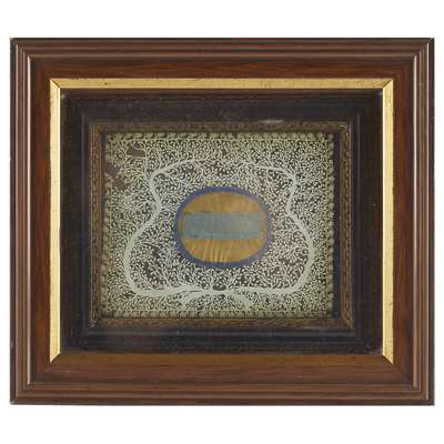CONTAINED WITHIN A FRAME, SURROUNDED BY A DECORATIVE FOLIATE CUT PAPER DESIGN,